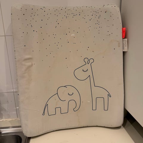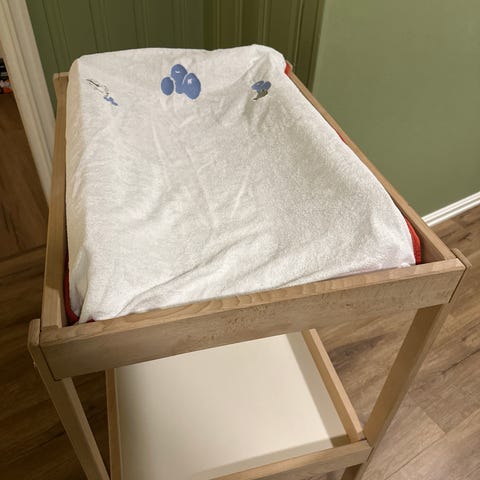 IKEA stellebord med oppbevaring i tekstil. Stellebordet har en polstret stellematte på toppen og flere tekstillommer på siden til bleier, kluter og annet utstyr. På langsiden mot veggen er det festet tre plastbeholdere som kan brukes til oppbevaring av småting. Rammen er i treverk, og tekstil og plastdeler er i lyse, nøytrale farger som passer inn i de fleste barnerom og bad.