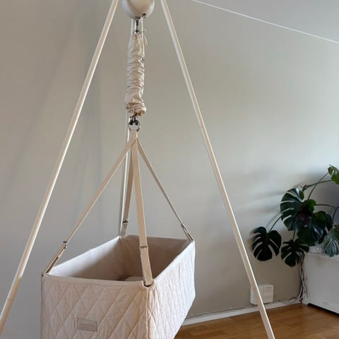 Hjemmelaget babygym i treverk med skinnsnorer hvor du kan henge ulike leker. Den har en sprekk - se bilde. Jeg ville fikset denne før bruk. Selges derfor svært billig til noen som kan fikse og bruke videre! Hentes på Nesoddtangen.