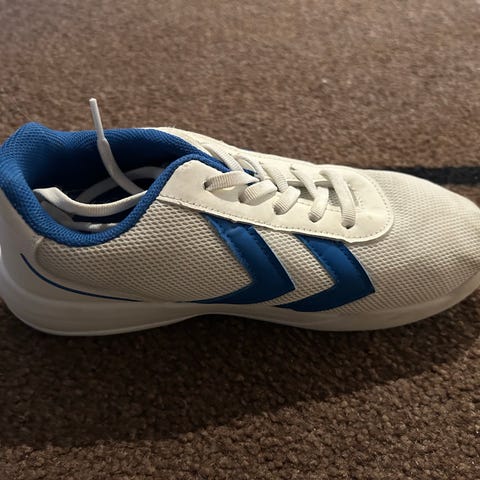 Ett par hvite treningssko i merke Hummel - str 34. Har stort sett vært brukt i hall, men også noe ute på friidrettsbane (i tørt vær).