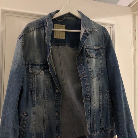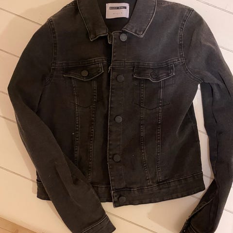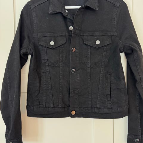 Bershka denimjakke for dame i størrelse M. Jakken er svart og laget av bomull. Klassisk dongerijakkemodell med krage, knappelukking foran og brystlommer med klaff og knapp. Ermene har mansjetter med knapp. Passer til hverdagsbruk og kan kombineres med ulike antrekk gjennom sesongene.