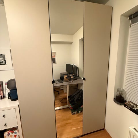 Selger en svært pent brukt IKEA PAX garderobe med speildører og integrert belysning.