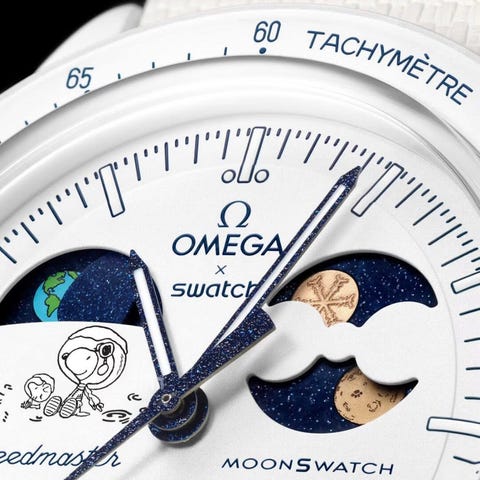 Under UV light, a secret detail appears on the moon phase mask and disc. A moon with various shades of blue can be seen on the battery cover. All dials in the collection carry the OMEGA X Swatch branding, the iconic Speedmaster logo and the MoonSwatch logo. The box-shaped biosourced glass construction, the etched "S" in the center of the glass referencing the Swatch logo, the fine and sophisticated circular pattern on the dial outer ring and the recessed subdials, the sharp and smooth lugs construction and of course the unique Bioceramic feel are common to all models. The indexes, hour and minute hands and chronograph seconds hand sport Grade A Super-LumiNova® for a perfect glow in the dark.