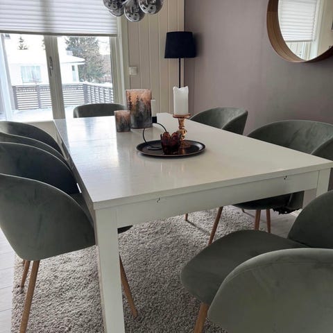 Spisestolene er av typen RISSKOV fløyel mørkegrønn ifra Jysk. 4stk stoler. Ny pris 4000 kr for 4 stk