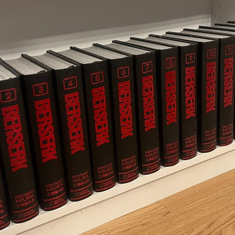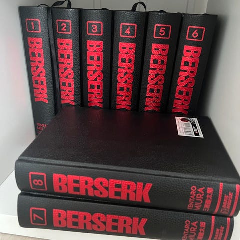 Berserk Deluxe Edition manga, bind 1 og 2. Innbundne bøker med svart omslag og rød titteltekst. Inneholder samlinger av kapitler fra Berserk-serien i stort format. Tekst på engelsk.