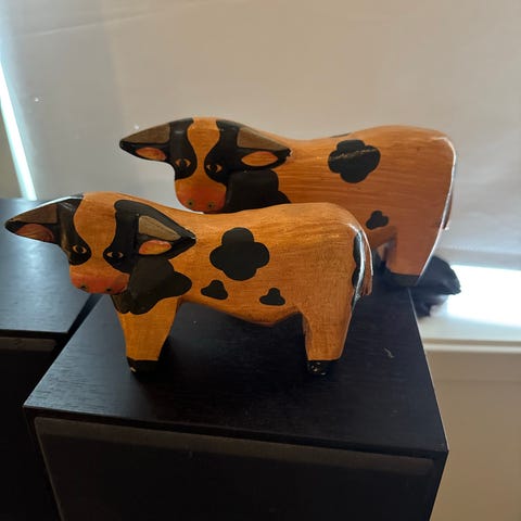 Dekorative trefigurer formet som kuer i brun- og beigetonet bemaling. Figurene har en stilisert utforming med markerte øyne og malte mønstre på sidene. Passer som pyntegjenstander på hylle, skjenk eller vinduskarm, og kan brukes samlet som et lite sett eller hver for seg. Ubrukt, men slitt over tid. Selges samlet.
