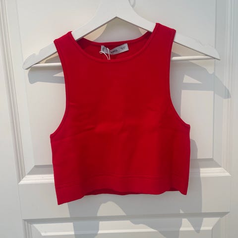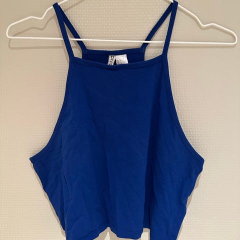 Zara tanktopp for dame i størrelse M. Modellen er en kort, ermeløs topp med rund hals. Toppen er blå og laget i polyester. Passer som enkel overdel til hverdagsbruk eller sammen med annet tøy i garderoben.