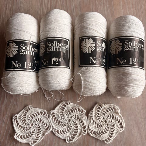 Solberg Spinderi bomullsgarn 12.3 og 12.4 Fra landhandel 1960. Garnet er gulnet .Ligger i hesper ( 22 stk)og egner seg til veving, hekling eller strikking av tekstiler der ubleket bomull ønskes. Passer til ulike håndarbeidsprosjekter som duker, løpere, håndklær eller andre produkter i bomullsgarn.