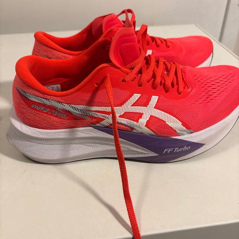 Asics Gel Nimbus 27. Selger mine favoritt sko da jeg har kjøpt nye sko. Dette er mine absolutt favoritter når det kommer til langdistanse. Løpt 300 km I disse. De tåler 1000 km +. Fungerer utrolig bra og har god demping. Et lite hull på venstre fot ved tåen.