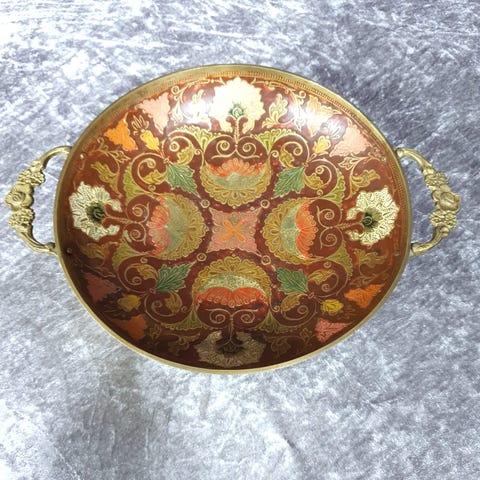 Dekorativ messingbolle med emaljert påfuglmotiv, trolig fra India.