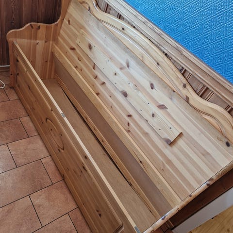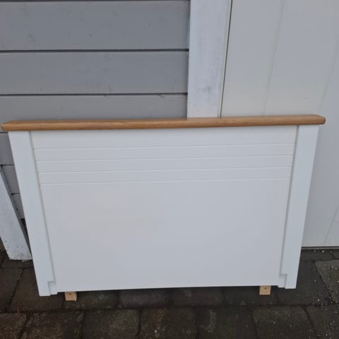Selger en solid og dekorativ sengegavl i heltre eik.