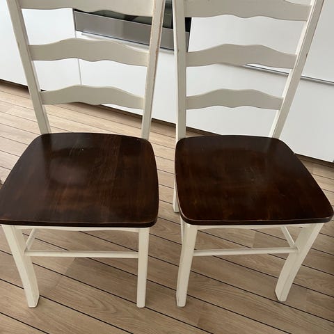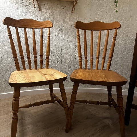 2 stk spisestoler av ukjent merke gis bort mot henting. Treverket er synlig slitt, men kan slipes.