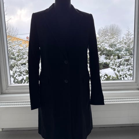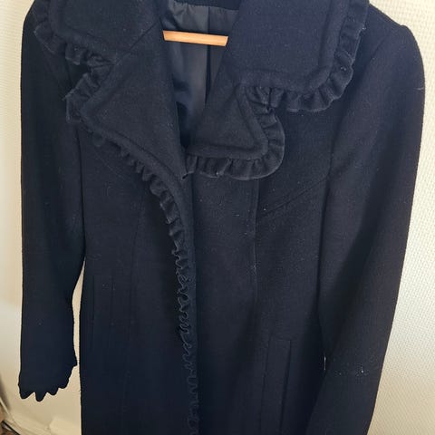 Fin svart kåpe selges billig fordi den har en del lo etter et ullskjerf jeg har brukt med kåpen som må fjernes. Vises tydelig på bildene. Det kan sikkert fjernes med rull hvis man er tålmodig; evt rens. Pga dette selges den veldig billig. Utover dette i fin stand.