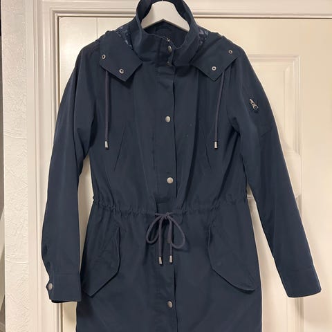 Jakke i blå farge, laget i polyester. Modellen er lårlang med hette og høy krage for ekstra beskyttelse mot vær. Den har glidelås foran med knappestolpe utenpå, samt glidelåslommer i sidene. Justeringsmuligheter ved ermer og hette kan gi bedre passform.