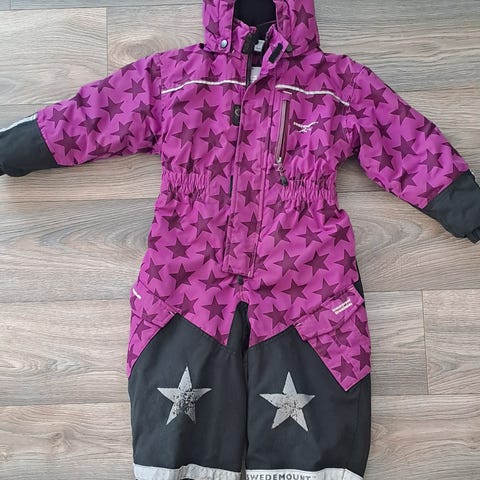 Vinterdress I str 70 fra Swedemount. Med lapp og aldri prøvd engang. Vind og vann avvisende stoff. Avtagbar hette. Teipe sømmer og strikk i livet for fin passform. Fleece inni. Skikkelige strikker under beina og 2 lommer med bårrelås på sidene. Nypris var 899 kr.