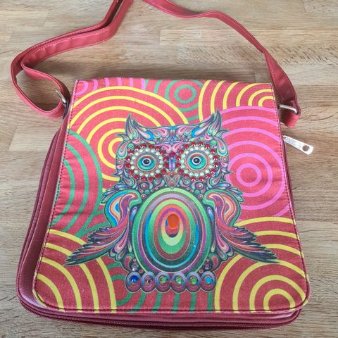skulderveske i kunstlær for dame. Vesken har svart bakside og skulderrem med røde detaljer, samt rød og flerfarget front med grafisk blomsterprint av stoff.Den har glidelåslukking øverst og ekstra glidelåslomme på baksiden. Innvendig er vesken fôret med stripete tekstil og har flere små lommer som egner seg for organisering av mindre eiendeler. Passer som hverdagsveske eller til lett bruk når man ønsker en kompakt veske med skulderrem.