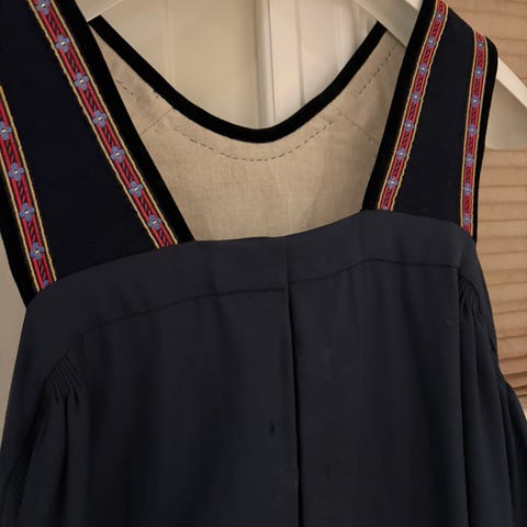 Stakkebånd er håndbrodert av min mor og stakken er sydd av ullstoff/ smokingstoff, så den er ikke tung.
