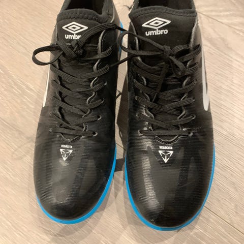 Umbro innendørs fotballsko i hvit, blå og oransje fargekombinasjon. Skoene har overdel i pustende tekstil med syntetiske forsterkninger og snøring foran. Yttersålen er i gummi med mønster tilpasset innendørs baner. Passer til bruk på innendørs underlag som hallgulv og lignende.
