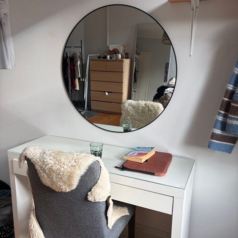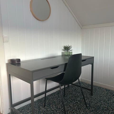 Stolen har noen bruksmerker. Skuffeseksjon og benkeplate er i fin stand.