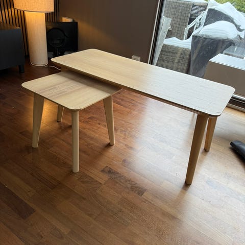 Pent brukt, men det er noen nesten ikke synlige sprekker/skjøter du kan kjenne om du drar hendene over bordet. Tatt nærbilder av bordoverflaten for å vise disse.