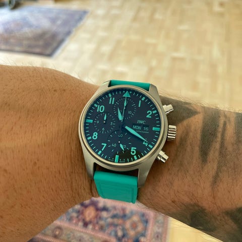 IWC har også inkludert dag- og datovisning samt en kronograf med stoppeklokkefunksjoner for timer, minutter og sekunder.