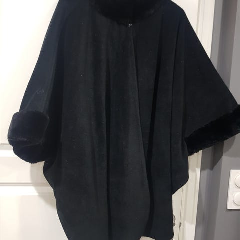 Donna Damo cape for dame i one size. Jakken er svart og laget i en kasjmirblanding, med myke pelset detaljer langs krage, frontåpning og ermeavslutninger. Modellen har vid passform og cape-lignende snitt, egnet som yttertøy i overgangssesonger og kjølige dager. Stoffet er merket «wool and cashmere, fabrics made in Italy».
