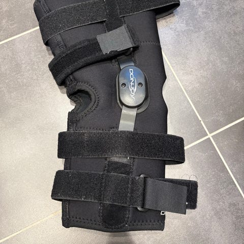 Kneortose str L/XL. Denne er venstretilpasset. Justerbar skinne som er låsbart i flere bevegelsesområder.