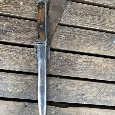 Nummerlik Krag bajonett med tilhørende slire. Bladet er i metall med tydelige bruksspor og patina. Håndtaket er i tre festet med skruer/nagler til metallrammen. Trenger litt stell og forsiktig pussing. Jeg tenkte å gjøre dette, men får aldri tid.