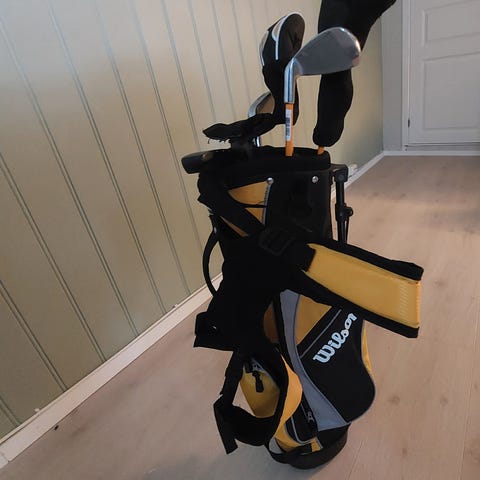 Royal Junior golfsett med bærebag. Tre av køllene er ubrukte og to knapt brukt. Køllene er 73-93 cm lange.