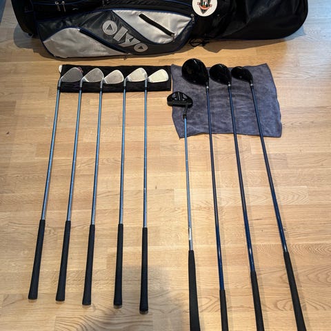Settet inkluderer flere jernkøller og en putter tilpasset juniorer. Skaftene er røde, og bagen er svart med røde felt og integrerte støtteben for å kunne stå oppreist på bakken. Egnet for barn/juniorer som trenger et komplett grunnsett med køller og bag til trening og spill på bane eller driving range.
