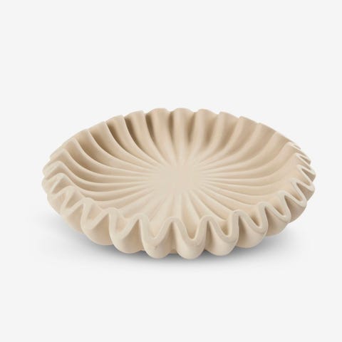 Den er laget i sement og har en lys, nøytral farge. Formen gjør den egnet som fruktbolle, serveringsbolle eller som dekorasjonsobjekt på bord eller benk. Passer i ulike interiørstiler og kan brukes som pyntefat , eller fruktbeholdning , kan stå ute også pga er laget fra sement