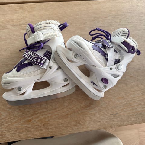 Graf justerbare skøyter for barn i størrelse 31. Skøytene har justerbar lengde (angitt 31–34 på sålen) og lukkes med kombinasjon av spenner og borrelås for enkel tilpasning. Overdelen er i syntetisk materiale med mesh-felt for ventilasjon, i fargene blå, svart og hvit. Egnet til generell skøytebruk for barn på isbaner og uteis.