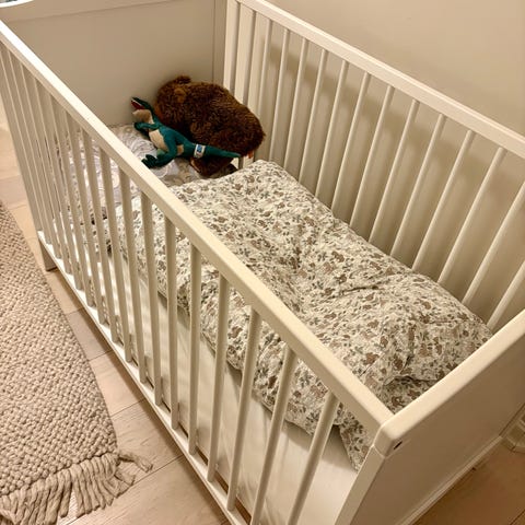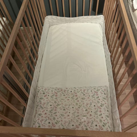Fullt funksjonell treseng for baby i alderen 0-18m. Inkluderer madrass og to hvite laken om nødvendig.