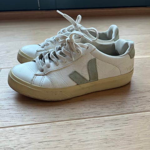 Veja sneakers joggesko i størrelse 37. Modellen er lave joggesko med snøring. Skoene er hvite med svart logo og svart hælparti med Veja-tekst. Yttersåle i gummi med mønster for grep. Passer til hverdagsbruk og fritid.