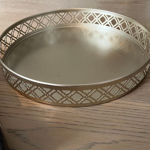 Brettet har en fin utskåret kant i metall og passer perfekt som dekor på stuebord, spisebord eller kommode. Kan brukes til lys, blomster, parfymer eller annen pynt.