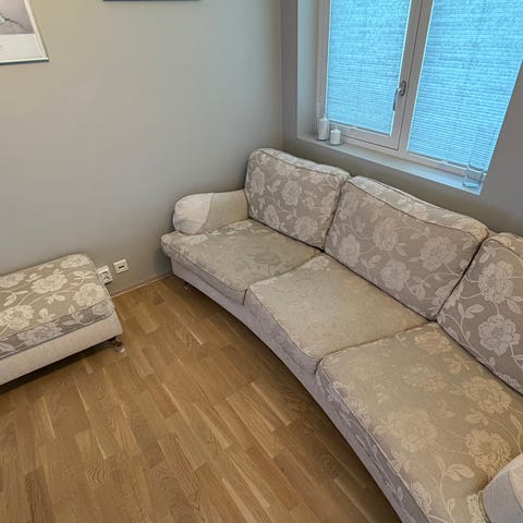 Sofaen ble kjøpt ny på Jysk sommeren 2023 til 3500kr (sofaen var da var på tilbud).