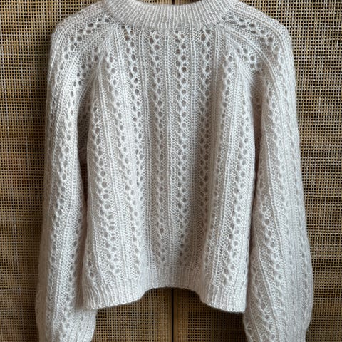 Hjemmestrikket genser til dame i størrelse M (evnt oversized S). Genseren er strikket i ull og er hvit. Nydelig og myk, varm og opplever den selv som kløfri. Kommer fra røyk-og dyrefritt hjem.