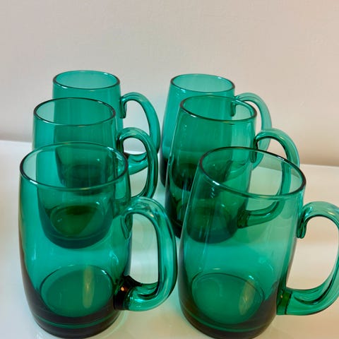Hadeland Glassverk krus i grønt glass. Kollenkrus. Krusene har hank og er laget i gjennomfarget glass. Er fra 70-tallet