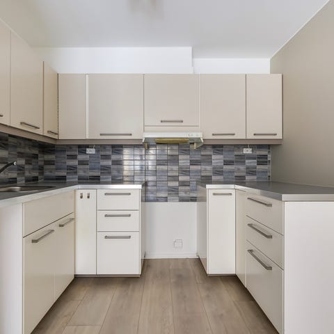 Hvit kjøkkeninnredning med overskap, underskap og høyskap