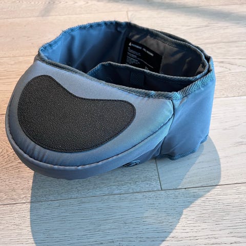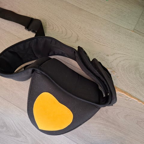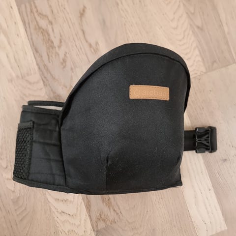 «Hoftesete fra Hippychick med et bredt, justerbart hoftebelte. Det har et polstret sitteunderlag for ekstra komfort. Perfekt å ha med på reisen. Hoftesetet gir en solid hylle for barnet ditt å sitte på, og støtter den tunge vekten fra undersiden. I stedet for å vri og bøye ryggraden, forblir brukerens rygg rett og støttet, og de små kan holdes inntil brystet, noe som gir komfort og trygghet for både voksne og barn.»