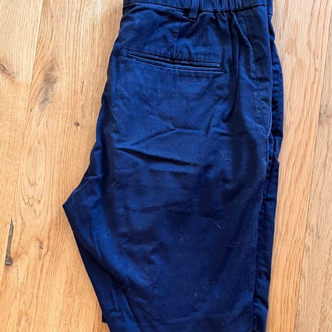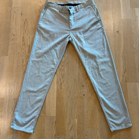 Selger et par med pent brukte bukser i lin-bomull-mix fra Arket. De er i en grågrønn farge, og har knyting på innsiden av midjen.