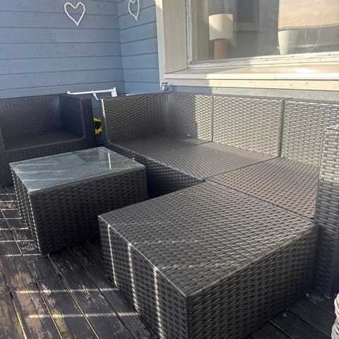 Det høye sofabordet måler ca. 100 x 60 cm og har bordplate i glass. Møblene er konstruert for utendørs bruk, for eksempel på terrasse, balkong eller i hage. Settet gir sitteplasser med rygg- og armlener, og bordet gir plass til servering eller avlastning.