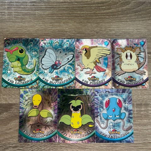 Bildene viser ulike typer kort, blant annet karakterkort med illustrasjoner av enkeltpokémon, episoderelaterte kort fra Pokémon-serien og et trenerkort med navnet «Pokémon March». Kortene har trykt tekst og illustrasjoner på begge sider.
