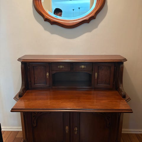 Skjenken ble kjøpt ny i fjor og har vært lite brukt. Den gir et eksklusivt uttrykk i rommet og passer perfekt til stue, gang eller spisestue. God oppbevaringsplass bak tre romslige dører.