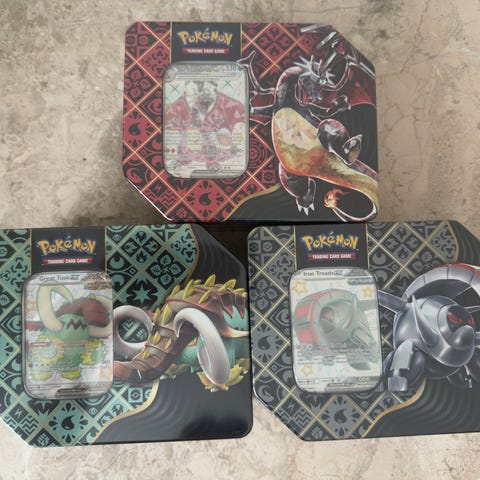 Selger en sealed Paldean Fates Special Tin med Shiny Iron Treads ex.
