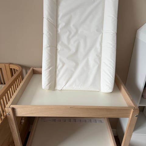 IKEA stellebord i lyst treverk med hvit stelleflate. Bordet har en opphøyd kant rundt stelleflaten for å bidra til at underlag og utstyr ligger stødig. Under stelleflaten er det en åpen hylle som gir plass til bleier, klær og annet stelleutstyr. Egnet til bruk på barnerom eller bad der man trenger en fast stelleplass.