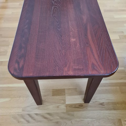 Trebord med fine detaljer og rødlig brunfarge selges da det ikke lenger passer med øvrig interiør i ny bolig. Noen merker på overflaten, men ellers veldig pent brukt. Må hentes.