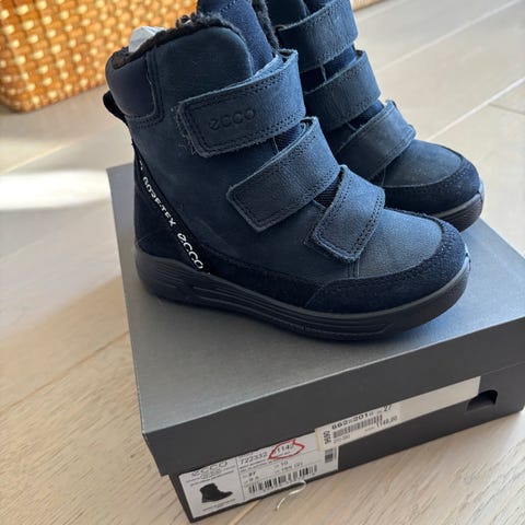 Ecco barnesko i størrelse 27 for unisex. Skoen er i hovedsak svart med blå detaljer og lisser. Modellen har høyere skaft som gir støtte rundt ankelen, og en kraftig yttersåle med godt mønster. Overdelen består av tekstil og syntetiske materialer. Egnet som hverdagssko eller til utelek for barn i den aktuelle størrelsen.
