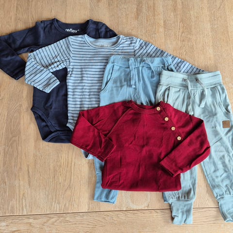 Alt er pent brukt av ett barn, jeg har ikke funnet noen spesielle skader eller flekker. Pysjen er litt mer utvasket enn det andre.