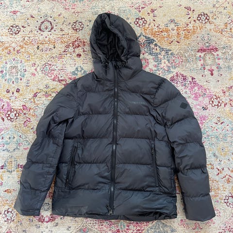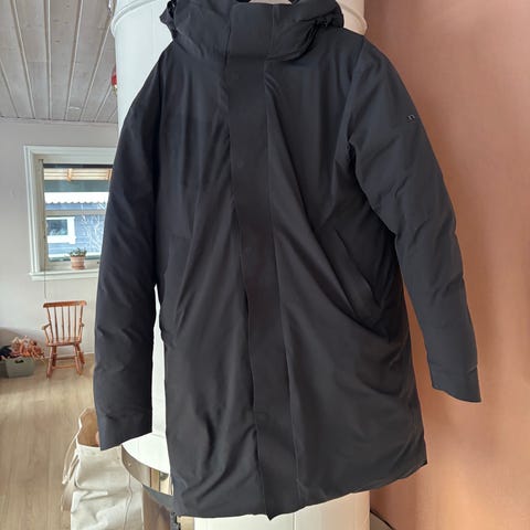 J. Lindeberg vinterjakke for herre i størrelse M. Jakken er grønn med kontrastfelt og har ytterstoff i 100 % nylon, . Modellen er en foret, vattert jakke som dekker overkroppen godt og har høy krage.
