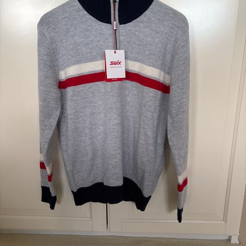 Swix genser for dame i størrelse M. Strikket modell i 100 % ull, i rød farge med Swix-logo foran og merke på ermet. Genseren har høy hals med kort glidelås og ribbestrikkede mansjetter og nederkant. Egnet som varm mellomlag eller fritidsgenser i kjøligere vær.
